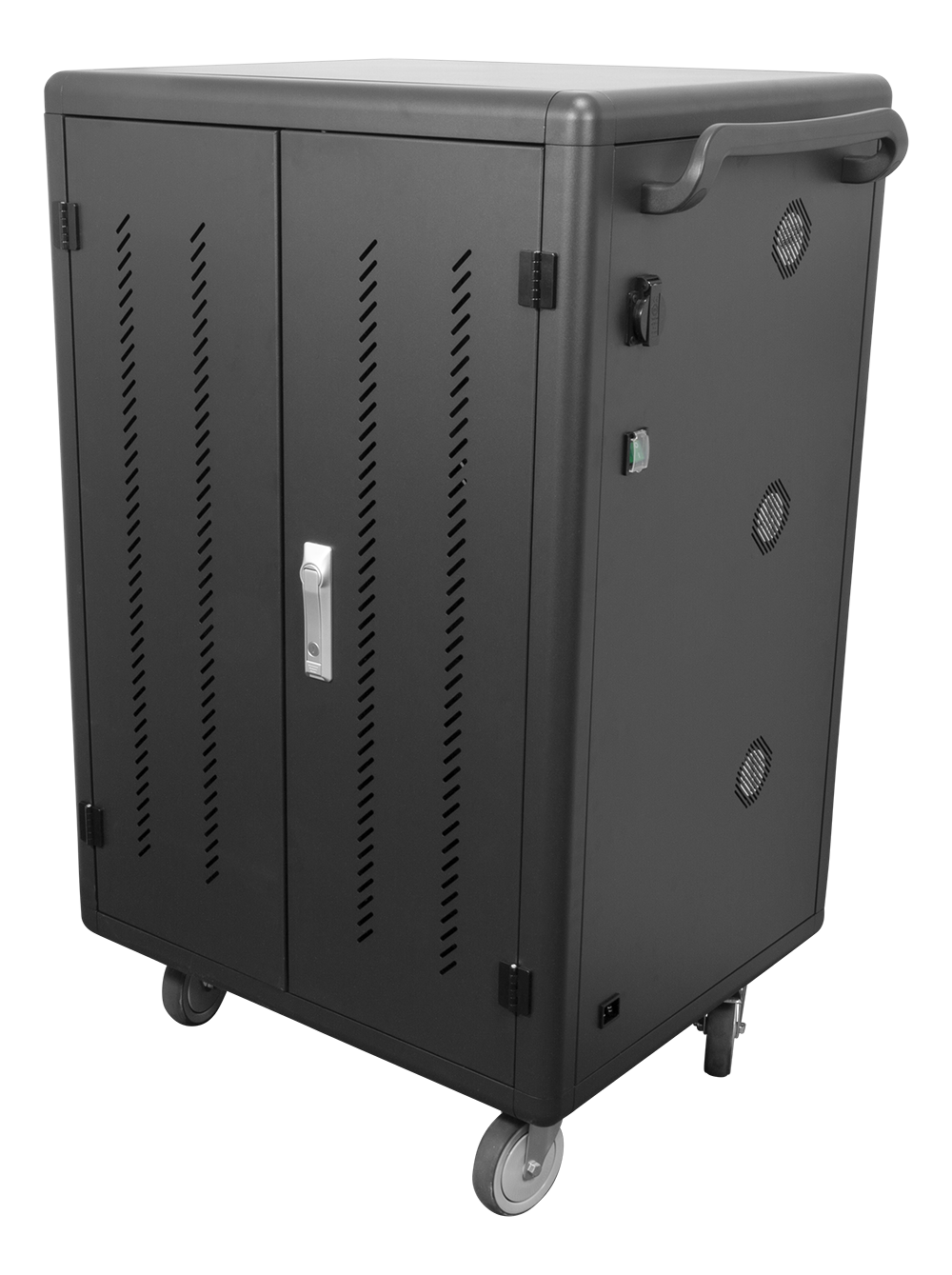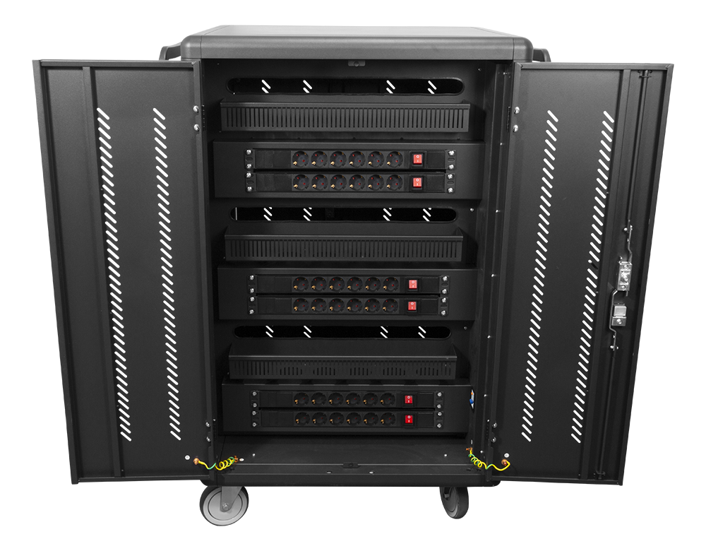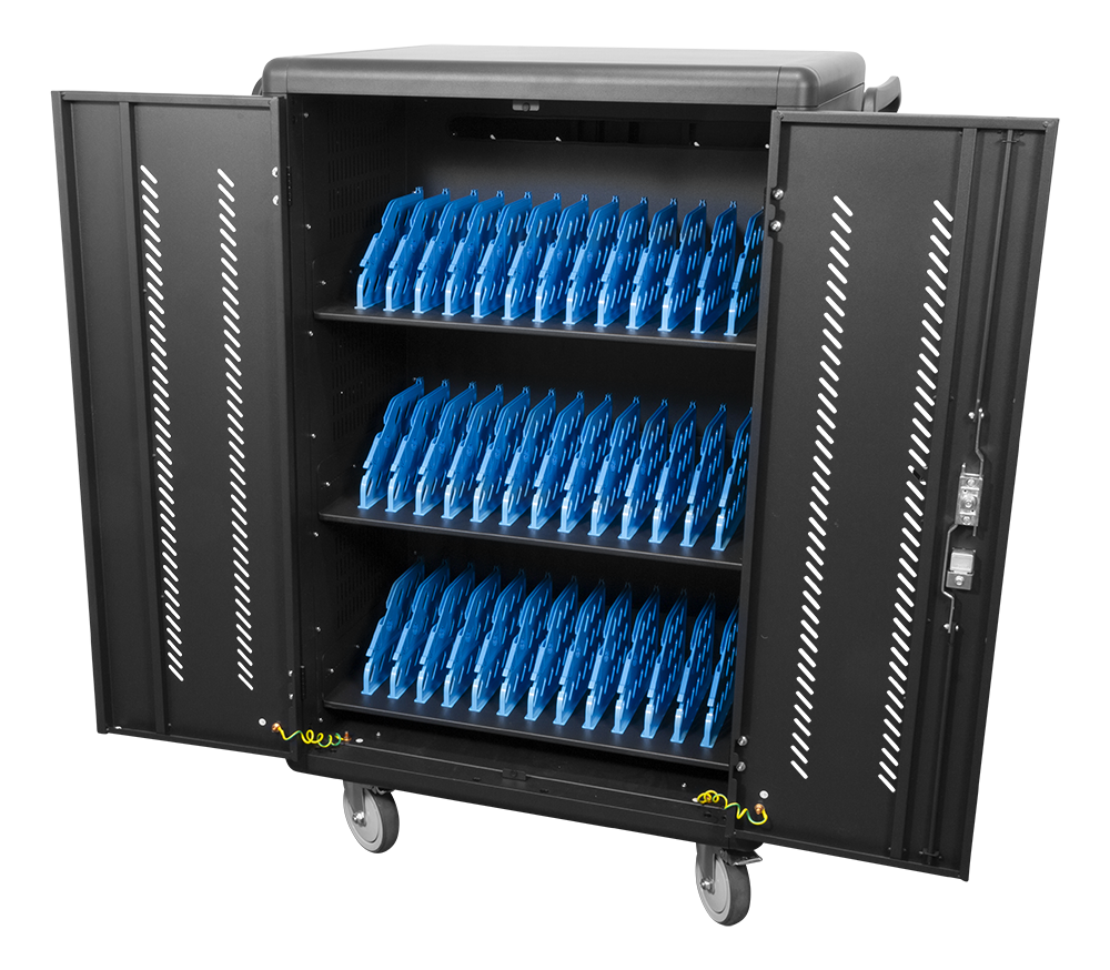 Uzlādējiet, uzglabājiet un transportējiet līdz 36 klēpjdatoriem vai planšetdatoriem, kuru izmērs nepārsniedz 14 ". Lādēšanas ratiņi ir izgatavoti ar alumīnija ritenīti un ritentiņiem, lai tos varētu pārvietoties starp telpām, un tie ir aprīkoti ar dubultām durvīm, lai ērti piekļūtu ierīcēm, un slēdzeni drošas uzglabāšanas atslēga.