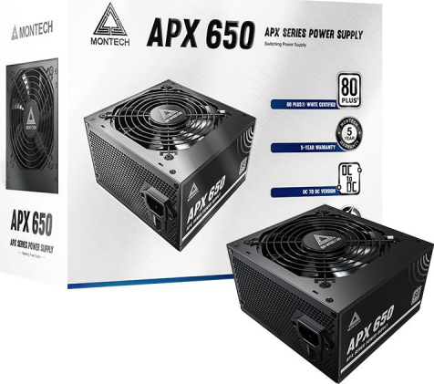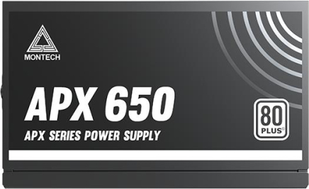 Montech APX650. Total power: 650 W, AC input voltage: 100 - 240 V, AC input frequency: 50/60 Hz. Motherboard power connector: 20+4 pin ATX. Purpose: PC, Power supply unit (PSU) form factor: ATX, 80 PLUS certification: 80 PLUS White. Product colour: Black, Fan diameter: 12 cm, Number of fans: 1 fan(s). Compliance certificates: CB, CE, EAC, Federal Communications Commission (FCC), RCM, RoHS, UKCA, cTUVus