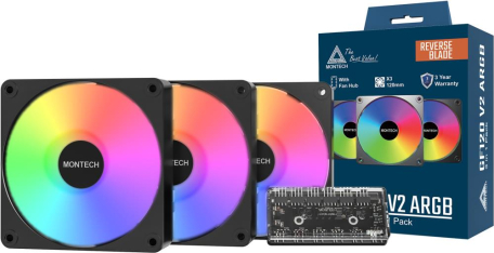 Montech GF120R V2 ARGB. Type: Fan module, Fan diameter: 12 cm, Rotational speed (min): 800 RPM, Rotational speed (max): 1600 RPM, Maximum air pressure: 1.5 mmH2O, Bearing type: Hydro Dynamic Bearing (HDB). Voltage: 12 V. Width: 120 mm, Depth: 25 mm, Height: 120 mm. Product colour: Black
