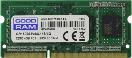 Moduļu skaits: 1, Pielietojums: portatīvajam datoram (SODIMM), Atmiņas tips: DDR3, Atmiņas apjoms: 4 GB, Frekvence: 1600 MHz, CL radītājs: CL11, Spriegums: 1.35 V. |