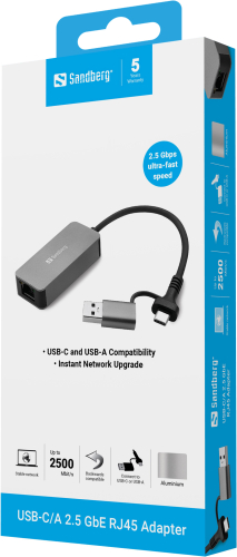 Sandberg 136-68 USB-C/A 2.5 GbE RJ45 Adapter, 2.5 Gigabit Ethernet on USB-C