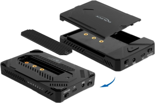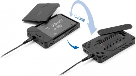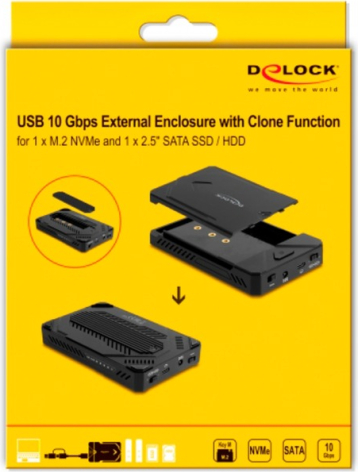 DeLOCK USB Type-C Enclosure for 1 x M.2 NVMe SSD + 1 x 2.5” SATA SSD / HDD, drive enclosure black, with clone function