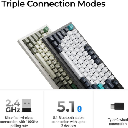 2.4 GHZ & BLUETOOTH Experience peak gaming performance on the fly with the 2.4 GHz wireless connection boasting a rapid 1000 Hz polling rate. For seamless multitasking across your computer, phone, and tablet, you can effortlessly connect the Q1 Max via Bluetooth 5.1 to three devices.