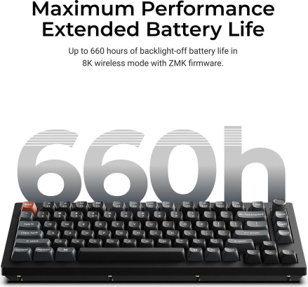 Keychron V1 Ultra 8K Meet the Keychron V1 Ultra 8K, a next-generation 75% wireless custom mechanical keyboard engineered for unparalleled performance. It supports 2.4 GHz wireless, Bluetooth 5.3, and wired connections. Powered by ZMK firmware, it enables an 8K polling rate in wireless mode while delivering up to 660 hours of battery life. Enhanced with multiple layers of acoustic foam and Keychron Launcher, it offers a refined typing experience with premium sound and complete customization.