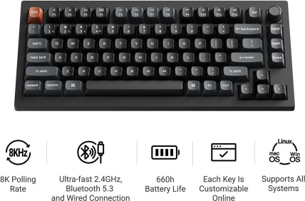 Keychron V1 Ultra 8K Meet the Keychron V1 Ultra 8K, a next-generation 75% wireless custom mechanical keyboard engineered for unparalleled performance. It supports 2.4 GHz wireless, Bluetooth 5.3, and wired connections. Powered by ZMK firmware, it enables an 8K polling rate in wireless mode while delivering up to 660 hours of battery life. Enhanced with multiple layers of acoustic foam and Keychron Launcher, it offers a refined typing experience with premium sound and complete customization.