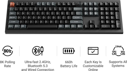 Meet the Keychron V6 Ultra 8K, a next-generation 100% full-size wireless custom mechanical keyboard engineered for unparalleled performance. It supports 2.4 GHz wireless, Bluetooth 5.3, and wired connections. Powered by ZMK firmware, it enables an 8K polling rate in wireless mode while delivering up to 660 hours of battery life. Enhanced with multiple layers of acoustic foam and Keychron Launcher, it offers a refined typing experience with premium sound and complete customization.