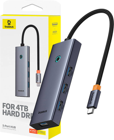 Baseus UltraJoy 5-Port 5-in-1 Hub (4xUSB3.0+PD) GrayThe Baseus BS-OH149 is a hub equipped with four ultra-fast USB-A ports and a USB-C PD port, capable of delivering a maximum charging power of up to 100W. This device is compatible with numerous devices, including Huawei, Acer, HP, Lenovo laptops, and more, as well as up to 4 operating systems, allowing you to expand the capabilities of your devices and transfer files at speeds of up to 5Gbps. The elegant minimalist casing is not only stylish and easy to clean but also helps with proper heat dissipation.