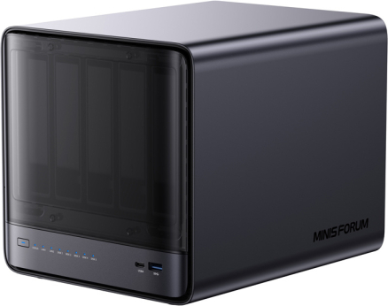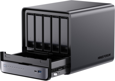MINI-PC Minis Forum NAS N5 Pro AMD Ryzen AI 9 HX Pro 370, 32GB+128GBThe Minis Forum NAS N5 Pro is a NAS-class PC built for the most demanding users - developers, engineers, data analysts and companies that need a reliable local AI infrastructure. Powered by the flagship AMD Ryzen™ AI 9 HX Pro 370 processor with 80 TOPS of processing power, it offers exceptional performance for computing, server and machine learning applications. It supports up to 96GB of DDR5 ECC memory, guaranteeing stability and lightning-fast data transfer in precision-intensive environments. A storage system with up to 144TB of capacity (5 HDD bays + 3 M.2 PCIe 4.0 SSDs) provides flexible configuration options - from project archiving to multimedia hosting. The industrial design is engineered for compactness, efficient cooling and quiet operation, while a rich set of ports, including PCIe x16, 10 Gbps LAN, 5 Gbps LAN and OCuLink, allows you to create advanced computing and networking systems. The whole thing is complemented by MinisCloud OS, which offers multi-scenario data handling - at work, at home and in the private cloud.