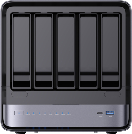 Thoughtful design for maximum convenienceThe NAS N5 Pro computer is designed to provide maximum functionality while maintaining compact dimensions (199 × 202 × 252 mm). The innovative 5-bay chassis accommodates as many as five drives in a space typically used for four, offering 25% more capacity without increasing the size of the unit. A slide-out motherboard allows quick access to components and seamless expansion of RAM or replacement of SSDs, while the modular design supports standard components, eliminating the limitations typical of integrated solutions. Efficient cooling is taken care of by the 9225 dual fan system, which actively dissipates heat from the HDD bays, ensuring stable and quiet operation even under heavy load. An additional USB-A port allows you to connect a system drive or backup media, maintaining the aesthetic, minimalist look of the case.