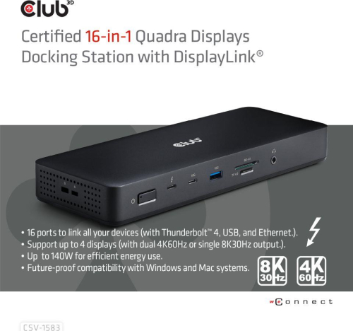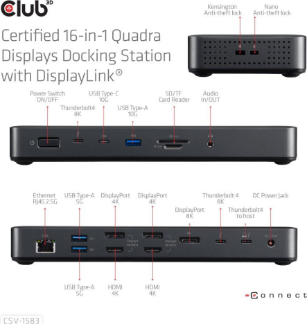 Thunderbolt 4 16-in-1 Quadra(4) Displays Docking Station Manufacturer Website: https://www.club-3d.com/en/detail/2655/thunderbolt_4_16_in_1_quadra(4)_displays_docking_station/ | ||||||||||||||||||||||||||||||||||||||||||