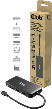 8-1 Portable Dock USB Type-C® 10Gbps to HDMI™ and DisplayPort™ 8K30Hz PD Max.100Watt Manufacturer Website: https://www.club-3d.com/en/detail/2696/8_1_portable_dock_usb_type_cr_10gbps_to_hdmit_and_displayportt_8k30hz_pd_max.100watt/ | ||||||||||||||||||||||||||||||||||||