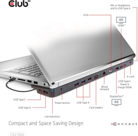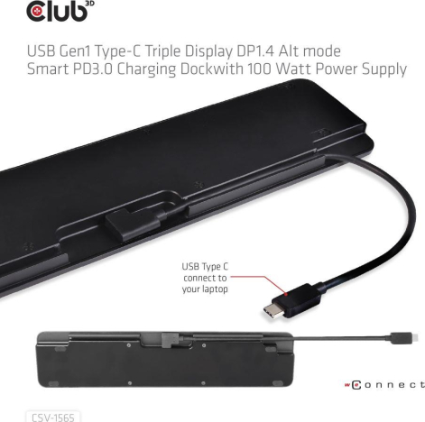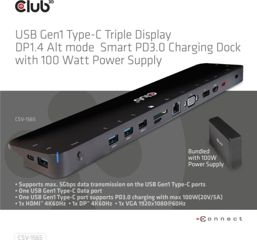 The Club-3D CSV-1565 USB Gen1 Type-C Triple Display DP1.4 Alt mode  Smart PD3.0 Charging Dock is an integrated solution combining Video, Data, Power, Ethernet and Audio especially for frequent travellers. The Three different Video ports(HDMI™, DisplayPort™, VGA) allow you to enjoy 3 different images(1x HDMI™ 4K60Hz or 1x DP™ 4K60Hz or 1x VGA 1920x1080@60Hz) or videos on 3 different displays(1x 4K30Hz+2x1080p@60Hz) outputs under MST mode  simultaneously. The USB Type-A ports and USB Type-C data port allow you to connect multiple USB devices to the host. The USB Type-C charging port allows you to provide power for this Dock and can charge the host PC at the same time by connecting a PD3.0 power Adapter, no need to carry your Notebooks PowerSupply. So in general the user is travelling lighter. The Micro SD and SD/MMC ports allow you to read information in the memory card onto the host. The 3.5mm audio port allows enjoying music of the host via a headset. Besides, with the Gigabit Ethernet port, you can enjoy high speed Ethernet on the host. It supports all DP1.4 Alt mode supported hosts. (PC, Laptop, Mobile phone, etc.) Dynamic Current Detection and Power Distribution, the product no longer intercepts the fixed power from the external PD3.0 Power Supply, but intercepts it according to the actual power consumed by itself, so that the PC can be dynamically charged more power. For Video Signal the source device needs to support DisplayPort™1.4 Alt Mode.