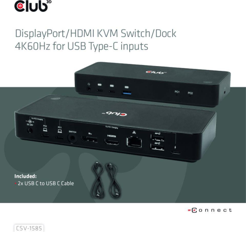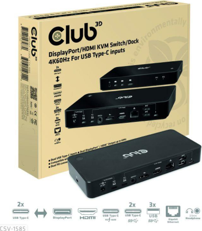 DisplayPort/HDMI KVM Switch/Dock 4K60Hz For USB Type-C inputs Manufacturer Website: https://www.club-3d.com/en/detail/2647/displayport-hdmi_kvm_switch-dock_4k60hz_for_usb_type_c_inputs/ | ||||||||||||||||||||||||||||||||||||||