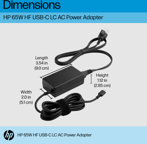 • The HP 65W HF USB-C LC AC Power Adapter works with any of your laptop's USB-C ports[1] so you can stop worrying about finding the right adapter.
