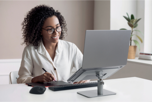 • Izstrādāts ergonomiskam komfortam, ļaujot pacelt ekrānu acu līmenī optimālam skatīšanās leņķim. • Regulējams augstums un slīpuma leņķis ērtai lietošanai: augstums no 151 līdz 200 mm, leņķis no 0° līdz 45°. • Atvērta ventilācijas konstrukcija veicina gaisa cirkulāciju, palīdzot uzlabot klēpjdatora veiktspēju un akumulatora darbības laiku. • Vieta zem pamatnes paredzēta ārējo piederumu glabāšanai, nodrošinot sakārtotu darba vidi. • Neslīdoši silikona paliktņi aizsargā ierīci no skrāpējumiem un notur to vietā darba laikā, bet drošības maliņa palīdz novērst slīdēšanu. • Piemērots klēpjdatoriem līdz 16 collām, maksimālā slodze – 8 kg | ||||