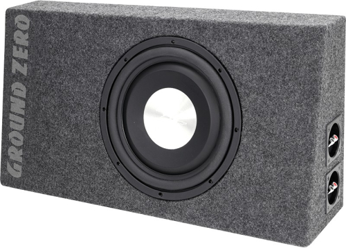 Ground Zero loaded enclosure with a 12″ driver is built to fit tight spaces. Depth is only 11.0/19.5cm. Goes behind sets to many vans and trucks. Very handy solution to mini-vans in to the side of the boot. Does not take much space in trunk even installed behind rear seats. - 12″ subwoofer in a sealed enclosure |