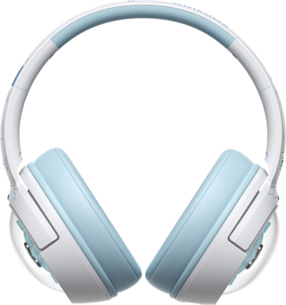 Close-up of a white-blue futuristic ear cup of Onikuma headphones