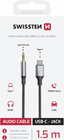 SWISSTEN Textile USB-C / 3,5 mm JACK audio adapteris melnā krāsā un 1,5 m garš ir lieliska izvēle. Pateicoties šim adapterim, jūs varat ērti savienot savas iecienītākās austiņas vai skaļruņus ar 3,5 mm AUX ieeju ierīcēm ar USB-C savienotāju, ko īpaši novērtē mūsdienu tālruņu un planšetdatoru lietotāji bez tradicionālās audio ligzdas. Kabelis ir aprīkots ar izturīgu tekstila pinumu, kas nodrošina aizsardzību pret nodilumu, kas garantē ilgu kalpošanas laiku un drošu skaņas pārraidi. 1,5 m garums nodrošina pietiekamu elastību ērtai lietošanai mājās un ceļā. Adaptera priekšrocības |