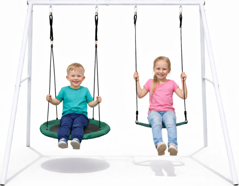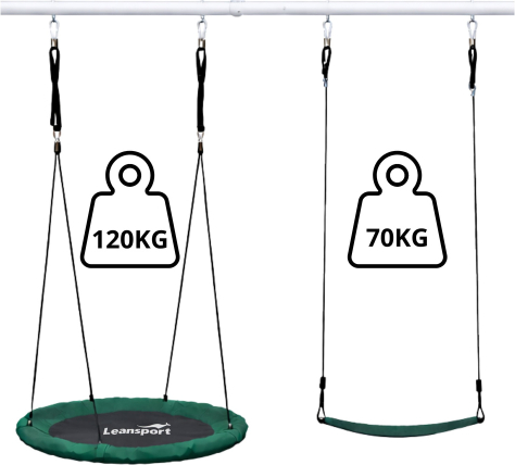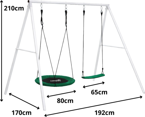 GARDEN SWING WITH A FRAME, STORK'S NEST, 80 CM, + SEAT This garden swing with a frame is a perfect solution for children and adults, providing active play and relaxation outdoors. Its robust construction and two different seats make the set functional and versatile, ideal for the garden, allotment, or home playground. The structure is made of durable steel tubes of varying diameters, ensuring high stability and safety. Additional reinforcement elements and ground nails allow the swing to be firmly anchored in the ground, ensuring the structure remains stable even during intensive use. The set includes a large 80 cm diameter stork's nest, providing comfortable relaxation, and a classic seat made of durable PE plastic. Materials such as 600D Oxford fabric and PP guarantee weather resistance and long life. Adjustable ropes, each 1.95 m long, allow the swing height to be adjusted from 140 to 180 cm, allowing it to be adapted to the user's height. Additional mounting elements, such as hooks, rings, and an adjustment system, ensure safety and comfort. This is the perfect set for everyday fun and relaxation, combining durability, functionality, and modern design. SPECIFICATIONS: