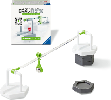 With the GraviTrax Element Zipline for the Ravensburger marble run system, long distances can be covered and different parts of the run can be spectacularly linked. A rolling ball triggers the slide. The sledge glides playfully to the finish line of the zipline and launches a new ball there. Large differences in height are no obstacle for the zipline! The new bracket system enables an even more stable transport of the sled - for even more GraviTrax action. GraviTrax is a flexibly expandable, interactive marble run system for children from the age of 8: With GraviTrax, children, young people and adults don't just build simple marble runs. They create unique ball track worlds. By freely designing the ball tracks and exploring the rolling behavior of the balls, the understanding of science is sharpened and gravity can be experienced up close. The GraviTrax universe includes three exciting lines - CORE, PRO and POWER. All GraviTrax lines and products can be freely combined with each other. The GraviTrax universe can be infinitely expanded through countless extensions with classic building blocks or stones that enable special action and tricks. In this way, everyone can tinker individually, try things out and surpass themselves.