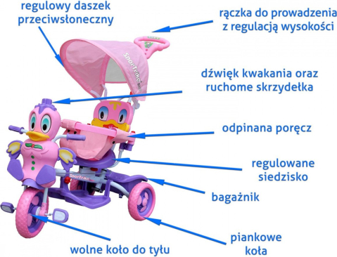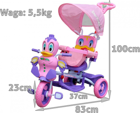 RoGer Duck Bērnu Trīsriteņu Velosipēds Ar Vecāku Rokturi ir spilgti rozā‑violets trīsriteņu velosipēds bērniem aptuveni no 12 mēnešiem līdz 5 gadiem, garums ap 83 cm, platums 48 cm un augstums 93–100 cm. Velosipēdam ir izturīgs tērauda rāmis, plati EVA riteņi (23 cm priekšā, 20 cm aizmugurē), regulējams vecāku vadības rokturis, drošības barjera un noņemams kāju balsts. Priekšējā daļa veidota kā pīlīte ar skaņas pogām, saules aizsargjumtiņš un mīksts sēdeklis ar atzveltni nodrošina komfortu. Aizmugurējais grozs ļauj pārvadāt rotaļlietas, maksimālā slodze ir 25 kg. Velosipēds sver aptuveni 5,5 kg, iepakojumā 6,5 kg, iepakojuma izmēri 63 × 34 × 31 cm, padarot to ērtu uzglabāšanai un pārvadāšanai. |