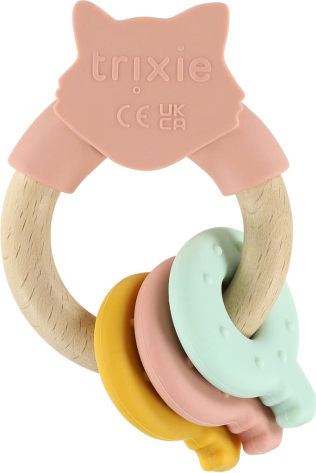 Trixie atslēgu formas zobgrauznis mazuļiem Ideāli piemērots mazo motorisko prasmju un roku koordinācijas attīstīšanai. Atslēgu formas zobgrauznim ir biezs koka gredzens un trīs mīkstas silikona atslēdziņas, kuras mazulim ir viegli satvert. Košļājot mīksto silikona materiālu un dažādas tekstūras, tas mazulim atvieglo smaganu sāpes un mazina diskomfortu dažādos zobu nākšanas posmos. Krāsas un noapaļotās malas padara zobgrauzni gan pievilcīgu, gan drošu.