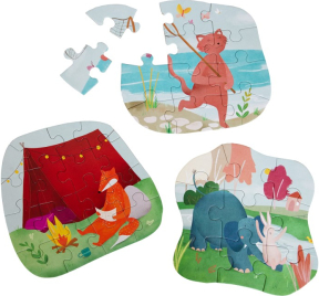 Jūtaties apmulsis? Arī mēs! Vērojiet, kā jūsu mazais eksperimentē ar šo puzļu trio, katrai no tām ir sava rotaļīga forma un atšķirīgs gabaliņu skaits. Virzieties uz priekšu no vienkāršākās līdz sarežģītākajai un izbaudiet attēlus ar jautriem dzīvniekiem, kas sanāk kopā, dodoties kempingā, ķerot tauriņus un spēlējoties parkā. Lieliski piemērots smalko motoriku un problēmu risināšanas spēju uzlabošanai.