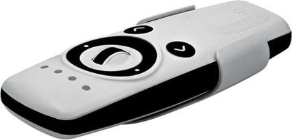 White Shelly remote control with black knobs and buttons, placed in a holder on a light background, seen from a side perspective.