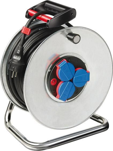 | Pagarinātājs. IP44. Spole - lokšņu tērauds / gumija. Izturīgs pret koroziju, stabilu atbalsta rāmi, 3 kontaktligzdas ar pašnoslēgšanās vākiem. Kabeļa tvertne ir aprīkota ar pārkaršanas aizsardzību. Kontroles lampiņa reaģē uz pārkaršanu un pārslodzi. Piemērots iekšdarbiem un īstermiņa izmantošanai ārpus telpām. |