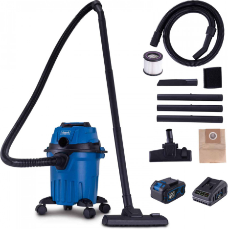 | Kompakts putekļsūcējs mitrai un sausai sūkšanai. Ar 10 kPa maksimālo sūkšanas jaudu un gaisa pūšanas funkciju. Izmēri G x P x A: 310 x 290 x 400 mm Maksimālā sūkšanas jauda: 10 kPa Tvertnes tilpums: 12 l Šļūtenes garums: 1,5 m Daļiņu izmērs: min. 0,3 µm Akumulatora spriegums: 20 V Motora tips: oglīšu motors Komplektā iekļauts 20 V Scheppach IXES 4,0 Ah akumulators un 2,4 A akumulatora lādētājs, 3 plastmasas pagarinājuma caurules, filtrs, papīra maisiņš (FSC sertificēts), putu filtrs, grīdas uzgalis, spraugu uzgalis, putekļsūcēja šļūtene. • Darbs bez vadiem ar Scheppach IXES 20 voltu sēriju – ar šo puteklu sūcēju var izmantot visus akumulatorus un lādētājus, kas pieder šai sistēmai. • Izturīga tvertne ar 12 litru tilpumu un ātrās atbrīvošanas slēdzi, kas ļauj viegli nomainīt maisiņu. • Mazgājams filtrs, kas arī filtrē sīkas putekļu daļiņas. • Liels darba rādiuss, pateicoties 1,5 m garajai šļūtenei un 3 papildu plastmasas pagarinājuma caurulēm. • Praktiska vieta piederumu uzglabāšanai, kas nodrošina sakārtotu un tīru darba vidi. • Ērts rokturis un 4 gludi 360° riteņi, kas nodrošina vieglu pārvietošanu. | ||||||||||||||||||||||||||