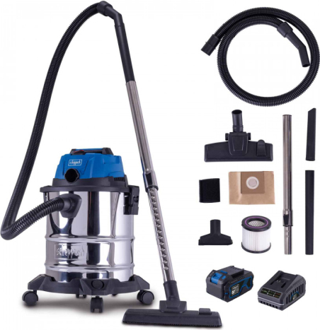 | Kompakts putekļsūcējs mitrai un sausai sūkšanai. Ar 10 kPa maksimālo sūkšanas jaudu un gaisa pūšanas funkciju. Izmēri G x P x A: 335 x 335 x 500 mm Maksimālā sūkšanas jauda: 10 kPa Tvertnes tilpums: 20 L Šļūtenes garums: 1,5 m Daļiņu izmērs: min. 0,3 µm Akumulatora spriegums: 20 V Motora tips: oglīšu motors Komplektā iekļauts 20 V Scheppach IXES 4,0 Ah akumulators un 2,4 A akumulatora lādētājs, 3 plastmasas pagarinājuma caurules, filtrs, papīra maisiņš (FSC sertificēts), putu filtrs, grīdas uzgalis, spraugu uzgalis, putekļsūcēja šļūtene. • Darbs bez vadiem ar Scheppach IXES 20 Voltu sēriju – ar šo bezvadu mitro/sauso putekļsūcēju var tikt izmantoti visi akumulatori un lādētāji, kas pieder šai sistēmai. • Izturīga tvertne ar 20 litru tilpumu un ātrās atbrīvošanas slēdzi, kas ļauj viegli nomainīt maisiņu. • Mazgājams filtrs, kas arī filtrē sīkas putekļu daļiņas. • Liels darba rādiuss, pateicoties 1,5 m garajai šļūtenei un papildu 3 plastmasas pagarinājuma caurulēm. • Praktiska vieta piederumu uzglabāšanai, kas nodrošina sakārtotu un tīru darba vidi. • Ērts rokturis un 4 gludi 360° riteņi, kas nodrošina vieglu pārvietošanu. | ||||||||||||||||||||||||||