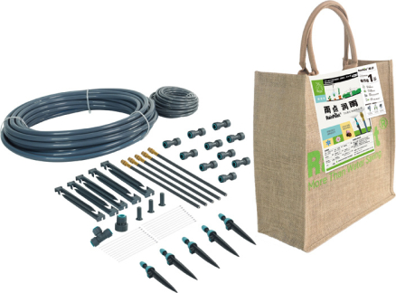 RainPoint irrigation kit with hoses, connectors, and stakes next to a beige jute bag with a label