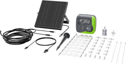 Solar panel, controller, hoses, drippers, connectors, and USB cables