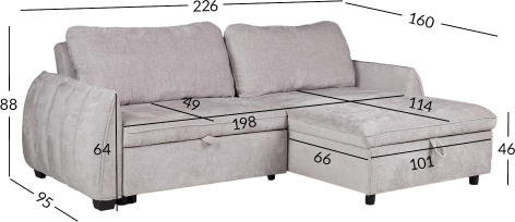 The overall dimensions of the sofa are 226x95/160x88cm. Seat width 198cm, seat depth 49(67)/114(132)cm. Seat height 46cm. Armrest height from the ground 64cm.