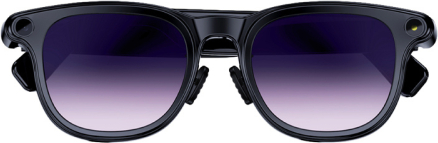 A man in a dark turtleneck and smart glasses with purple lenses looks to the side