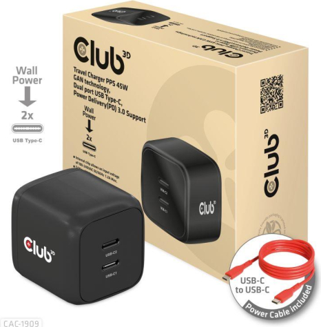 The Club3D CAC-1909 Travel Charger PPS 45W GAN technology, Dual port USB Type-C, Power Delivery(PD) 3.0 Support. Compact size & Superior Performance: GAN technology chipset makes this charger 50% smaller than traditional 45W charger, small enough to carry anywhere. The Programmable Power Supply(PPS) 45W wall charger match a variety of PD devices from smart phones to laptops, one for all making charging simple. This wide compatibility charger will be your convenient companion during your business trip or vacation. The Power Charger is light weight without compromising on Quality and safety. By adopting Power Delivery(PD) charging technology, this versatile Power Charger provides you with charging function through Dual USB Type-C interface, you can charge any connected Mobilephone / Tablet / NoteBook. Furthermore all it needs is a free USB Type-C port on your Dock/NoteBook/Tablet/ Mobile phone to be charged via the bundled USB cable.