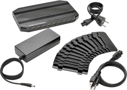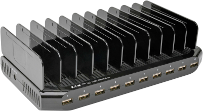 | Up to 5V 2.4A per port for charging battery-intensive devices; All ten ports support USB Battery Charging (BC) specification v1.2; External dual-voltage power supply with Schuko plug; Protects against overheating, overcurrent and overcharging; Includes 14 adjustable storage brackets for organizing devices; Charges anywhere AC power is available—no computer required (for 120V applications please use Tripp Lite's P013-Series cables, not included) More information: 10-port-usb-charging-station-with-adjustable-storage-12v-8a-96w-usb-charger-output-schuko-power-cord~u280010stcee (external link) | ||||||||||||||||||||||||||||||||||||||||||