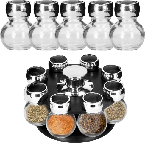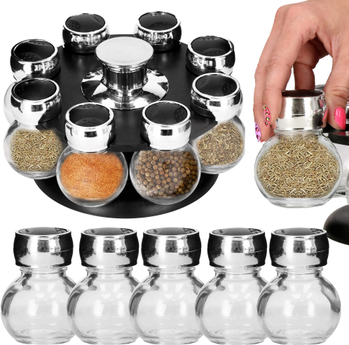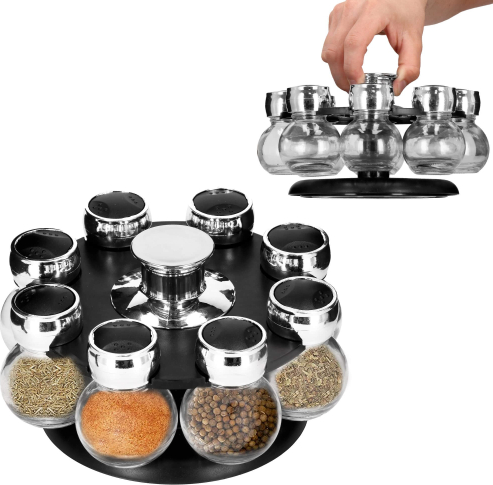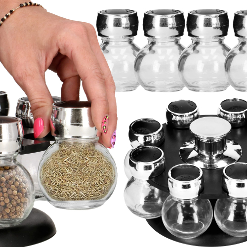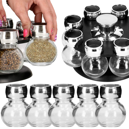 | Pamatfunkcijas: materiāls: plastmasa + metāls + stikls statīva krāsa: melna burkas krāsa: caurspīdīgs stikls + metāla skrūvējami vāciņi ar melnu elementu grozāms dizains 8 garšvielu burkas divfunkciju dozators (sietiņš / bez sietiņa) sertificēts kontakta apstiprinājuma pārtika materiāls neuzsūc smakas statīva centrā sudraba rokturis konstrukcijas pagriešanai Burkas izmēri: p> augstums: 8 cm platākais diametrs: 6 cm uzgriežņa diametrs: 4 cm Statīva izmēri: augstums: 13 cm diametrs: 23 cm pamatnes diametrs: 17 cm |
