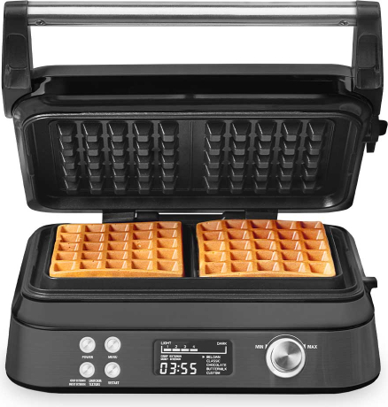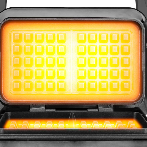 | 2 beļģu vafelēm 5 dažādas programmas (beļģu vafeles, klasiskās vafeles, šokolādes vafeles, piena vafeles un sava programma) Var izvēlēties vafeles tekstūru: mīksta iekšpusē, kraukšķīga ārpusē vai kraukšķīga, pilnībā cepta Var izvēlēties 7 brūnuma pakāpes Automātiska cepšana: ātra uzsildīšana ar 1600 vatiem zeltaini brūnai garoziņai, cepšana ar 800–1600 vatiem Divkārši sildelementi augšpusē un apakšā nodrošina vienmērīgu siltuma sadalījumu Īpaši dziļas sildīšanas plāksnes īpaši vieglām vafelēm, nepiedegošs pārklājums Vadība, izmantojot LCD displeju Atpakaļskaitīšanas taimeris parāda atlikušo cepšanas laiku Pārplūdes aizsardzība savāc lieko mīklu |