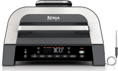 | 6 cooking functions: Grill, Air Fry, Roast, Bake, Dehydrate & Reheat - all in one appliance; Fast grilling & cooking: Cyclonic Air Technology & heavy-gauge grill plate cook food fast; Smart Cook System: Built-in thermometer probe removes guesswork, for the perfect cook level Up to 75% less fat than deep frying & cooks up to 45% faster than fan ovens More information: ninja-6-in-1-max-grill-air-fryer-dg551eu (external link) | ||||||||||||||||||||||||||||||||||||||||||||||||||||||
