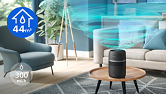 3 ventilatora ātrumi un automātiskie iestatījumi nodrošina vēlamo veiktspēju un komfortu. Pateicoties līdz pat 300 ml/h mitruma izdalīšanai, katra telpa līdz 44 m² tiek efektīvi mitrināta.