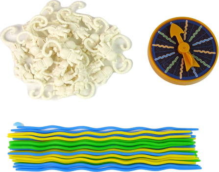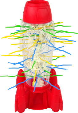 Arcade Game Falling Astronauts Rocket Discover an exciting arcade rocket tower game that will take you on a space adventure! The dimensions of the impressive tower are 28 cm x 17 cm x 17 cm. This set is ideal for lovers of space and entertainment. The set contains 30 white astronauts on sticks 17 cm long, available in three colors: yellow, blue and green. Start the game by assembling the racket and inserting the sticks into the correct holes. Astronauts dropped from the top of the tower hang on sticks from the folded part of their suit. Once all the astronauts are ready, the fun can begin. The first player chooses the color of the stick by turning the draw wheel. He then has to gently take out the corresponding colored stick, trying to avoid dropping the astronauts. The rule is clear: the person who drops the most astronauts loses. It's a game full of tension and excitement! The packaging dimensions are 21 cm x 27 cm x 6 cm, and the whole set encourages addictive space fun. Get ready to fly in space adventures that test your dexterity and reflexes!
