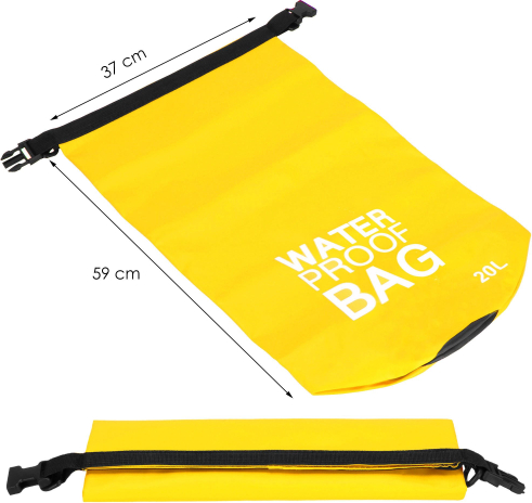 | Pamatdati:Ietilpība: 20L.Krāsa: dzeltena, melnaMateriāls: PVCAizdare: Roll-Top + aizdares sprādzesKomplektā ietilpst: 2 regulējamas siksnas, kas ļauj to nēsāt kā mugursomu vai somuIzmēri:Kopējais augstums, mērot pirms aizvēršanas: 59 cmPlatums augšpusē, mērot plakanā stāvoklī: 37 cmApakšā diametrs: 24 cm (nedaudz konusveida uz leju)Biezums: apm. 5 mmArmatūras lentes platums ap caurumu: 25 mmSpradžu izmēri: 40 x 30 mmPlecu siksnu skaits: 2Siksnas platums: 40 mmSiksnas garuma regulēšanas diapazons (mērīts bez stiprinājumiem): 95–50 cmPriekšrocības:Var nēsāt kā somu vai mugursomu, pateicoties pievienotajām siksnāmSalocīts izmērs, atkarībā no vajadzībām un iepakoto priekšmetu skaitaŪdensizturīgs un ūdensizturīgs materiālsIetilpīgsNav nodalījumu — var viegli ievietot lielākus priekšmetusSalocītā veidā tas aizņem maz vietasIdeāli piemērots lietošanai ūdens sporta entuziastiemIzturīgs pret visa veida netīrumiem, viegli mazgājams |