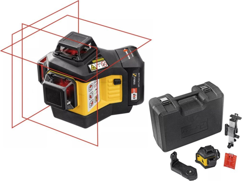 Ar 12 V CAS akumulatoru darbināms, pašizlīdzinošs daudzlīniju lāzers ar trim 360° sarkanām lāzera līnijām precīzam izkārtojuma darbam.