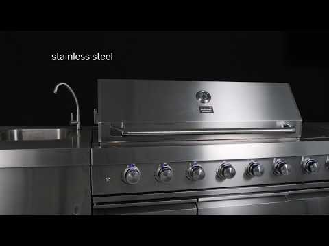 Pjezo aizdedze ir integrēta katrā vadības pogā ar gaismām. Sešas siltuma sadales plāksnes. Viscaur nerūsējošais tērauds. Dubults vāks ar termometru (0–430 ℃). Divas nerūsējošā tērauda grila restes 29 x 45,5 cm un viena čuguna režģis 35 x 45,5 cm. Sildīšanas statīvs 95,5 x 14 cm, nerūsējošais tērauds. Grilēšanas vieta ar gaismām. Iekļauts vāks un rotisera. Trīs skapji, trīs atvilktnes. 63 litru ledusskapis ar stikla durvīm 220-240V 50 Hz 80W IPX4 kompresors. Ar elektrotīklu darbināma cepeškrāsns. Ūdens krāns un izlietne.