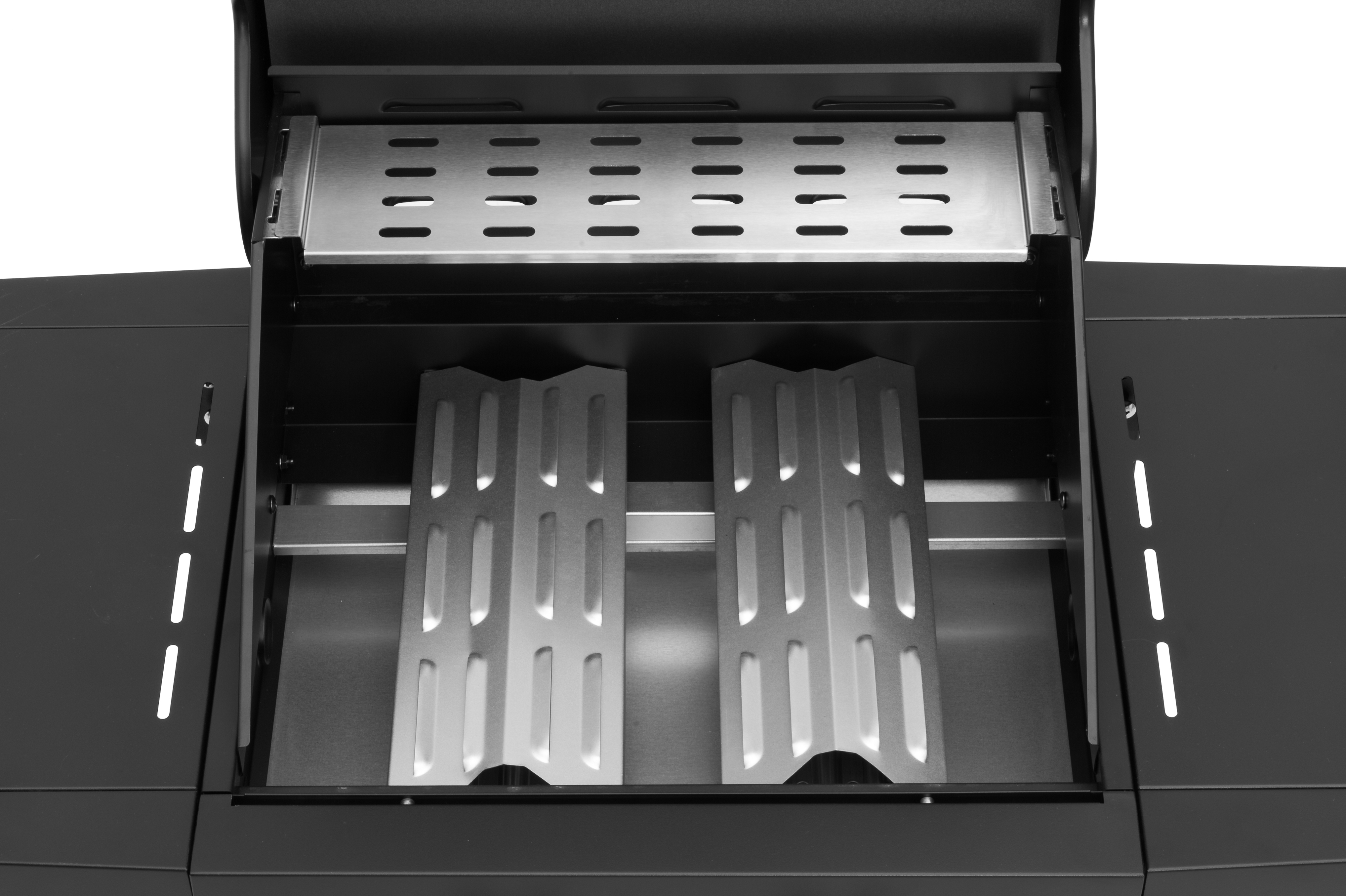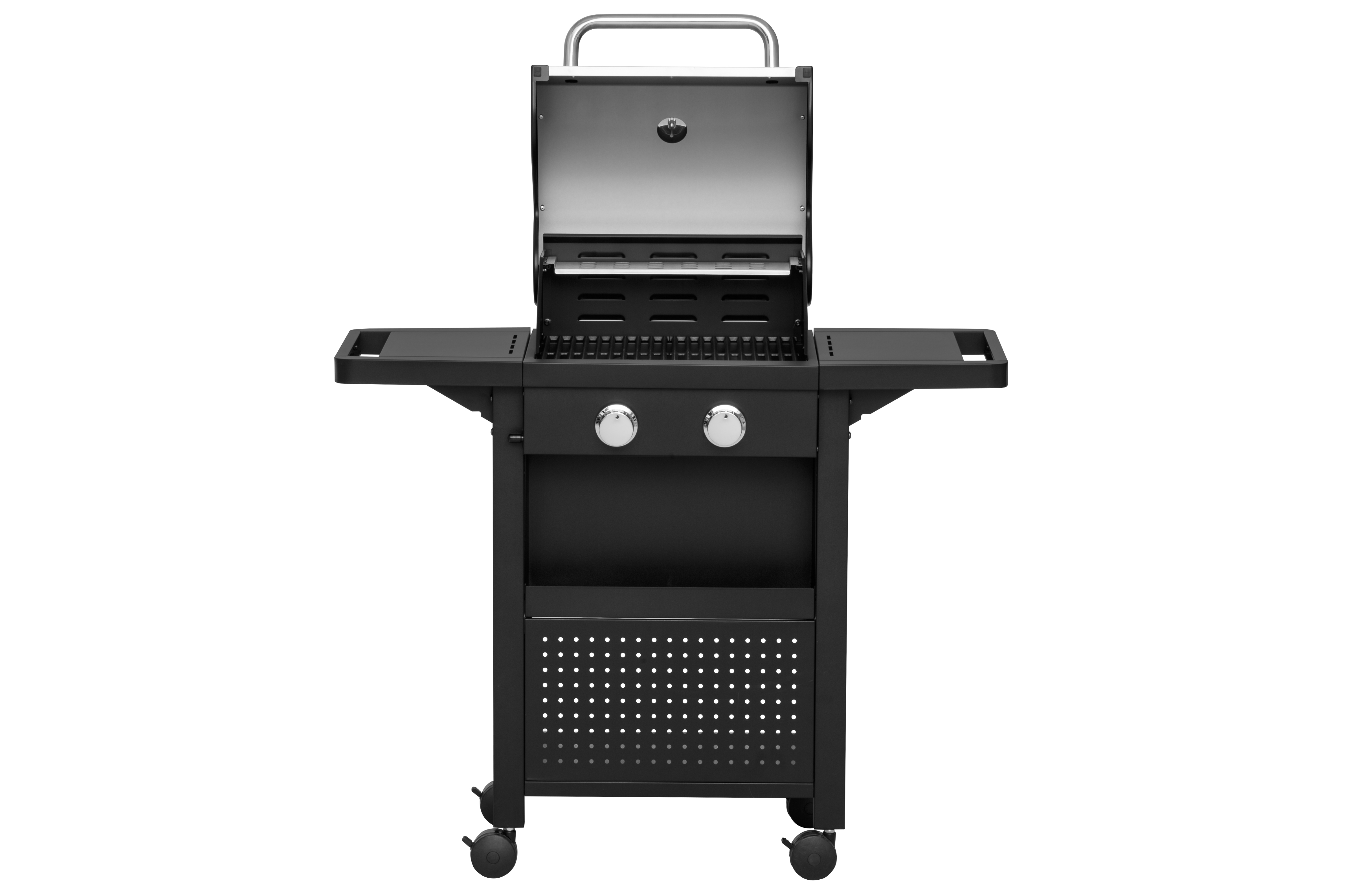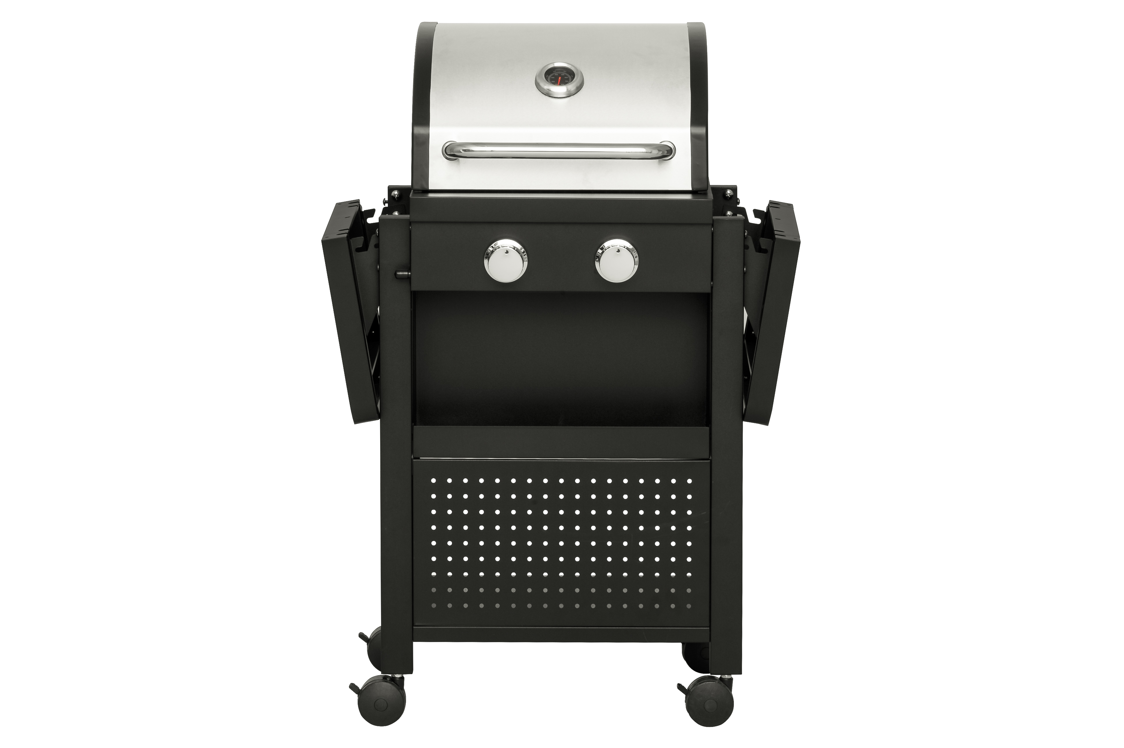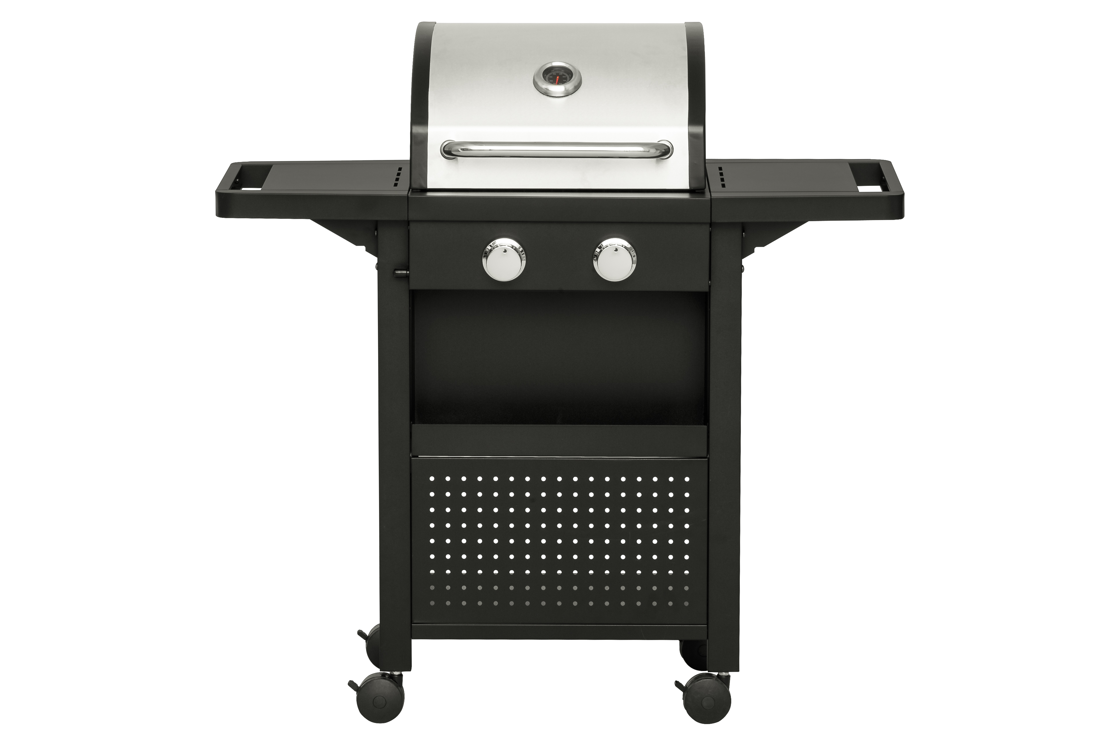 Gāzes grils ar diviem degļiem. Divi nerūsējošā tērauda degļi 3,2 kW Kopējā jauda – 6,4 kW. Grilēšanas zona – 43 x 39 cm. 2 matēti čuguna grila režģi 21,5 x 38 cm. Nerūsējošā tērauda sildīšanas režģis SS430 40 x 12 cm. Katrā vadības slēdzī iebūvēta pjezo aizdedze. Pulverkrāsota tērauda dubultais vāks. Termometrs uz vāka. Kurtuve, grila ratiņi un priekšējais panelis no tērauda ar pulvera pārklājumu. 2 siltuma sadales plāksnes no aluminizēta tērauda. Cinkota tauku paplāte. Pulverkrāsoti nolaižamie sānu paneļi. Priekšējais panelis ar piederumu grozu. 4 mazi bloķējami riteņi. Piemērots aizsargpārklājs 602300. Garantija – 2 gadi.