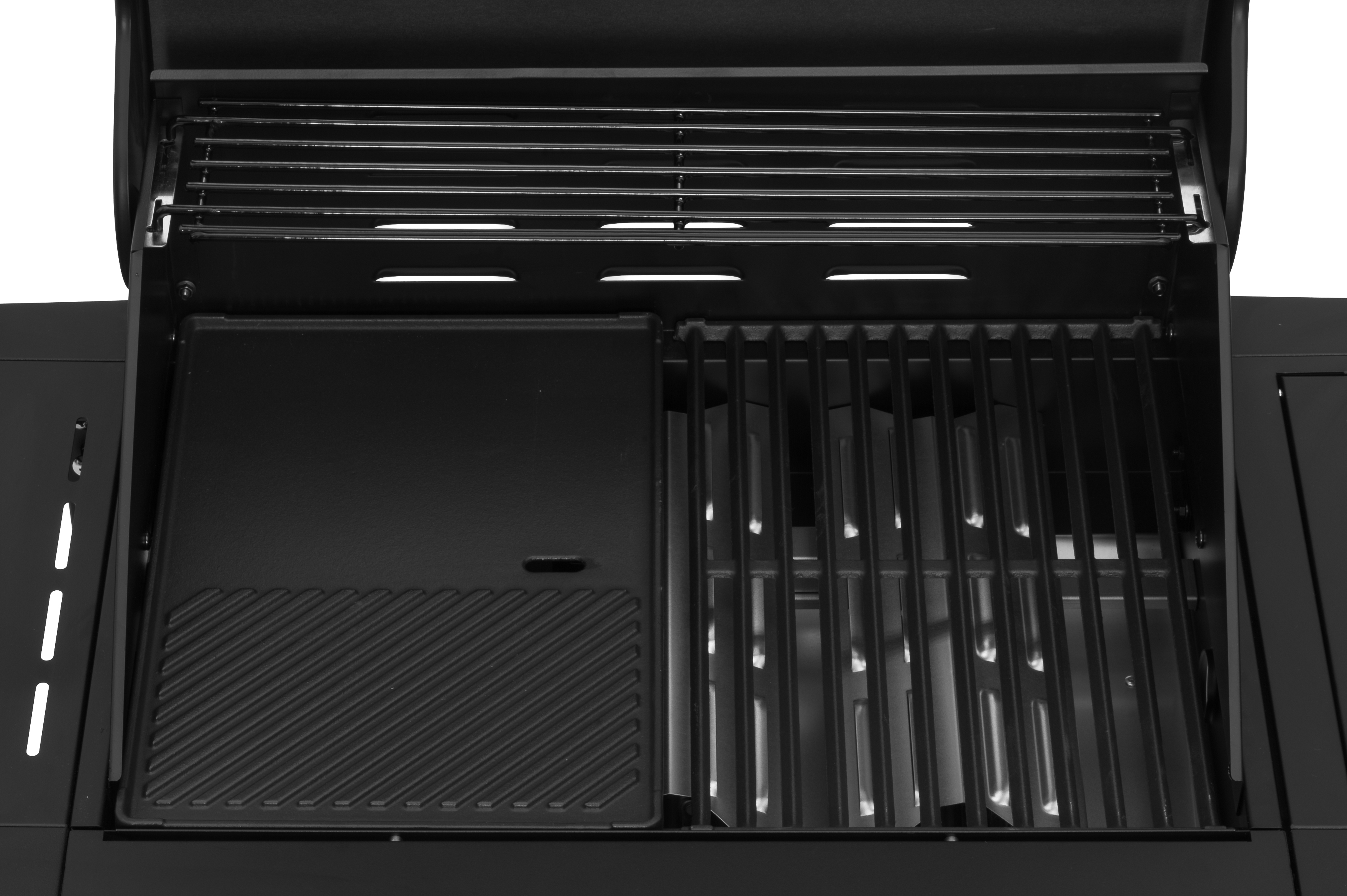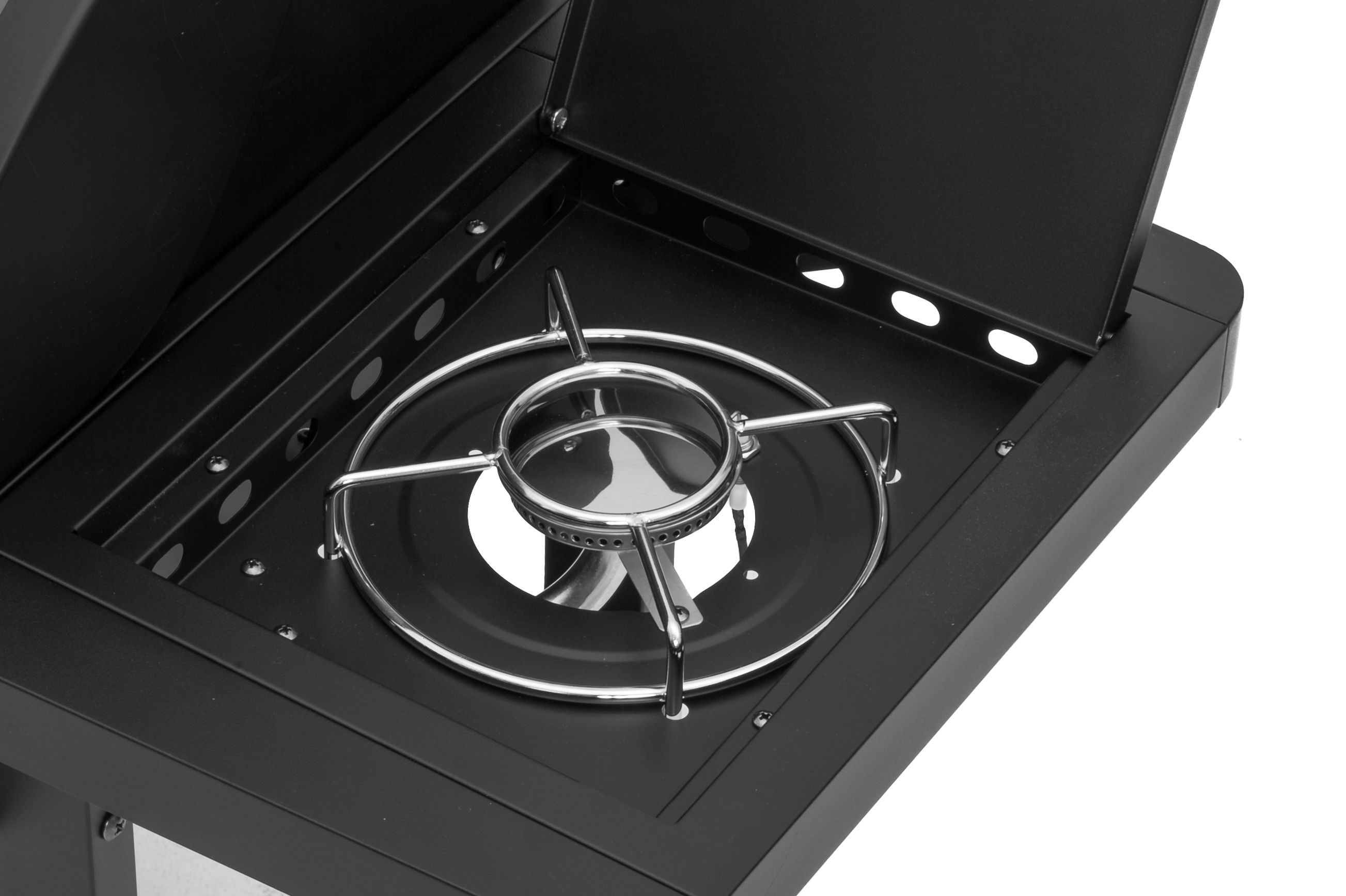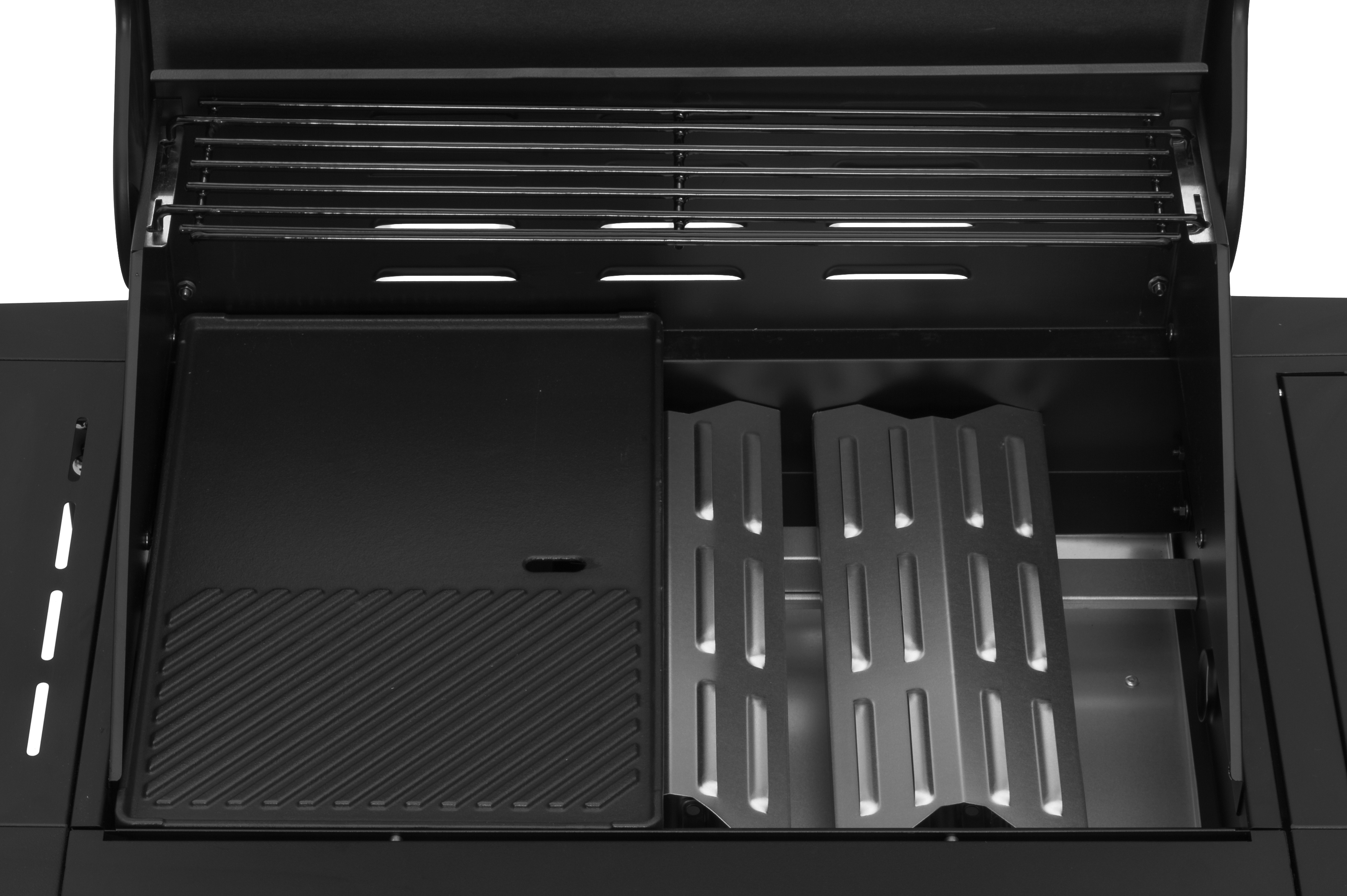 Gāzes grils ar trim degļiem un sānu plīti. Bārbekjū zona 53 x 38 cm. Trīs rastra degļi 3,2 kW un sānu plīts 3,2 kW. Kopējā jauda 12,8 kW. Katrai vadības pogai iebūvēta pjezo aizdedze.3 siltuma sadales aizbīdņi.