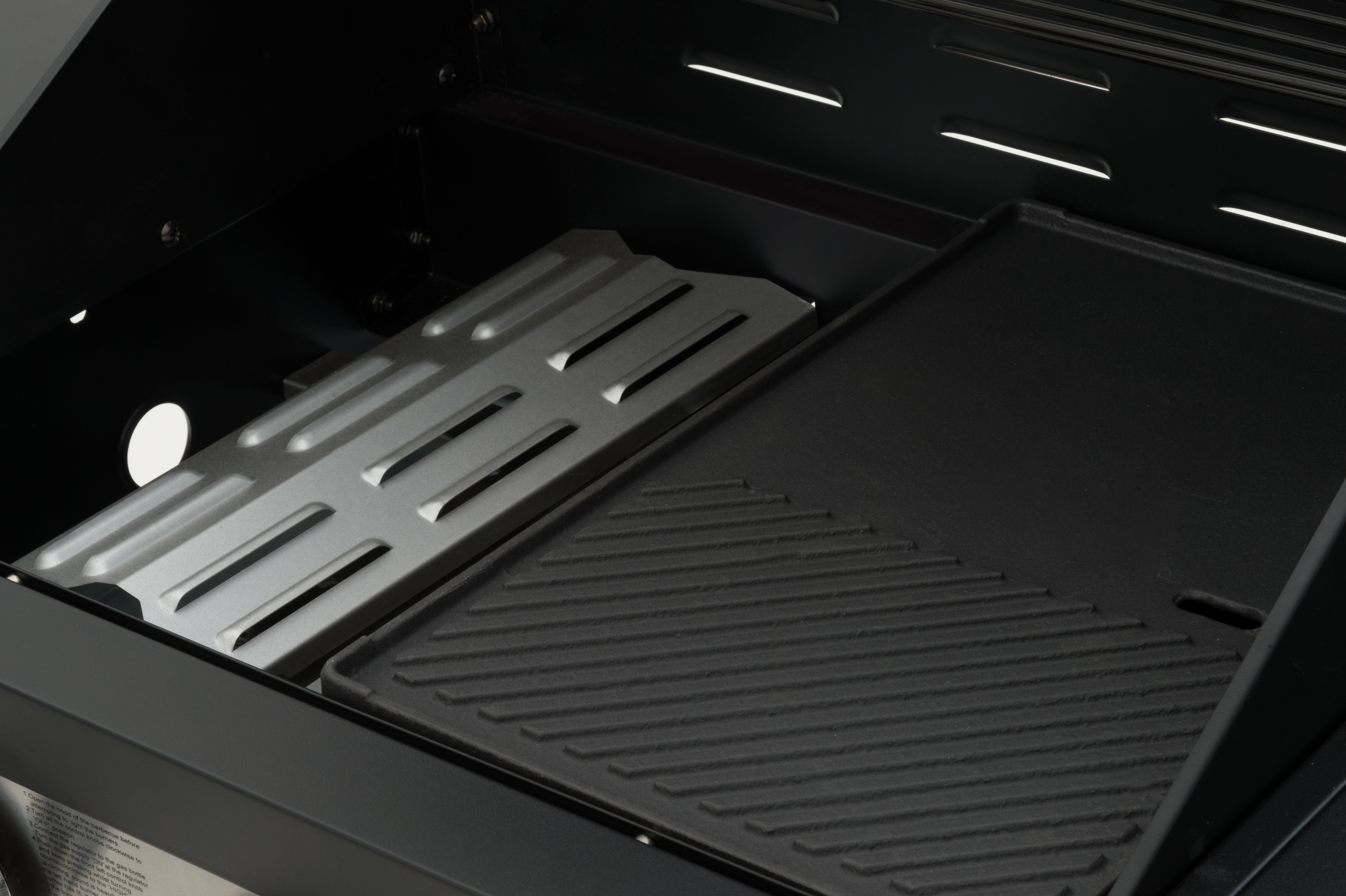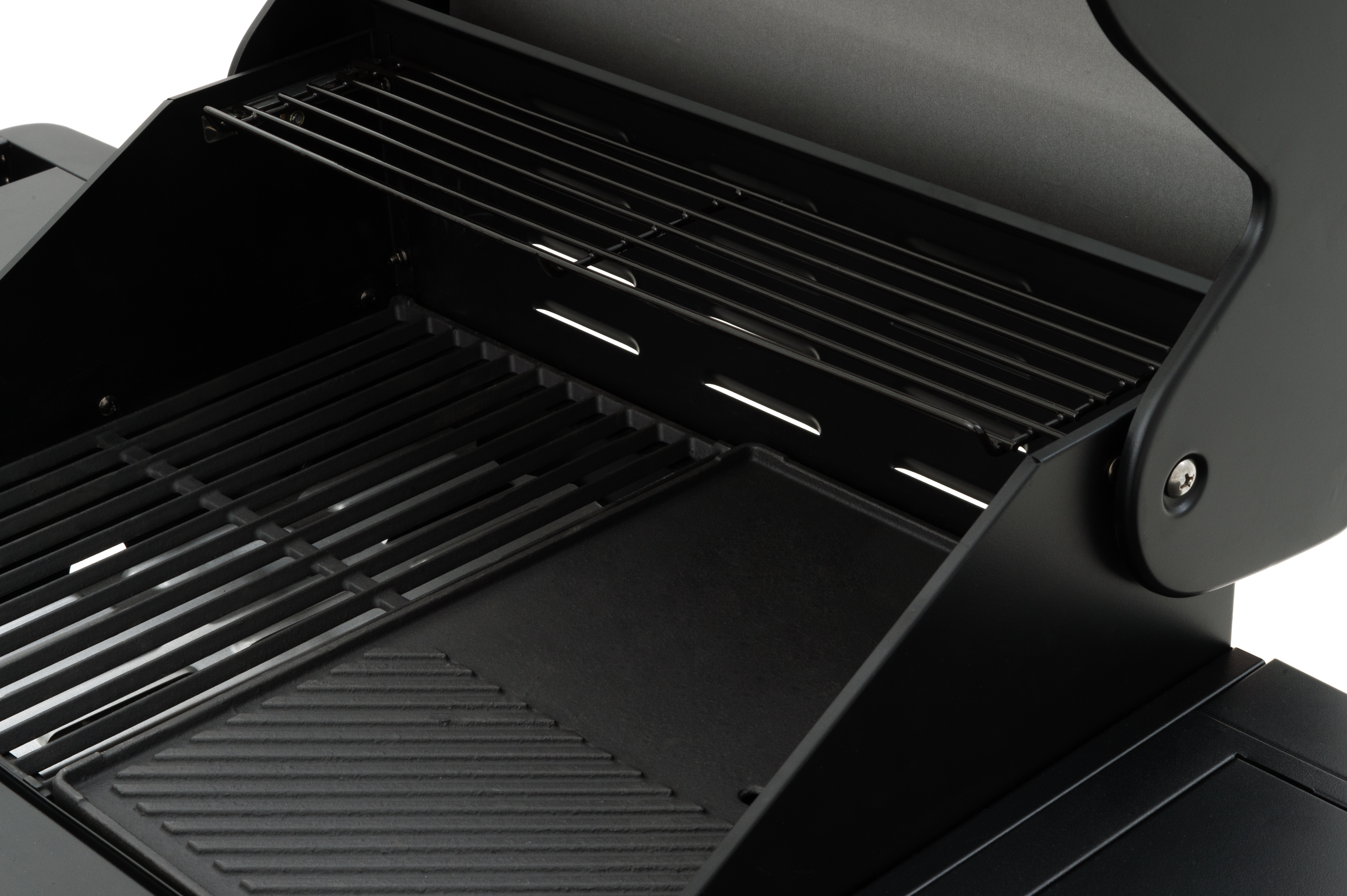 Pulverkrāsots pelēks dubultais vāks. Termometrs. Nerūsējošā tērauda rokturis. Ugunsgrēka kaste izgatavota no pulverkrāsota tērauda. 1 gab. matēta čuguna režģis 26,5 x 38 cm. 1 matēta čuguna gabals 26,5 x 38 cm. Vadības panelis izgatavots no nerūsējošā tērauda SS430. Apkures režģis emaljētas stieples tērauds 52,2 x 12,2 cm. 3 gab. siltuma sadales plāksnes no aluminizēta tērauda. Integrēta aizdedze vadības pogā. Cinkots tauku slāpētājs. Sānu līmeņi ar pulvera pārklājumu, no kuriem viens ir nolaižams. Ratiņi: sānu sienas ar pulvera pārklājumu (melnas). Pulverkrāsotas durvis (pelēkas). 4 mazi riteņi. Piemērots aizsargvāciņš 602300. Garantija 2 gadi.