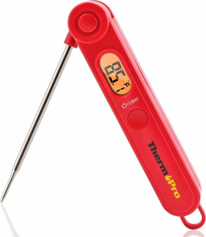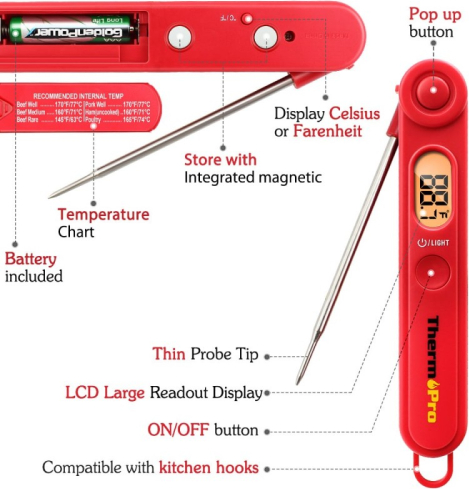 | Gatavojiet gaļu precīzi ar ThermoPro TP-03B! Šis kvalitatīvais digitālais termometrs katru reizi sniedz precīzus temperatūras rādījumus 4-7 sekunžu laikā. Termometrs ir salokāms, tam ir magnētiska aizmugure un āķis, tāpēc to var piekarināt pie grila vai virtuves skapīša. TP-03B ir lieliska izvēle gan pieredzējušiem, gan iesācējiem maizniekiem.