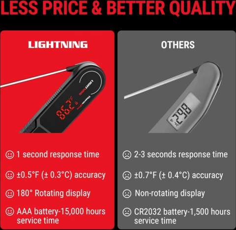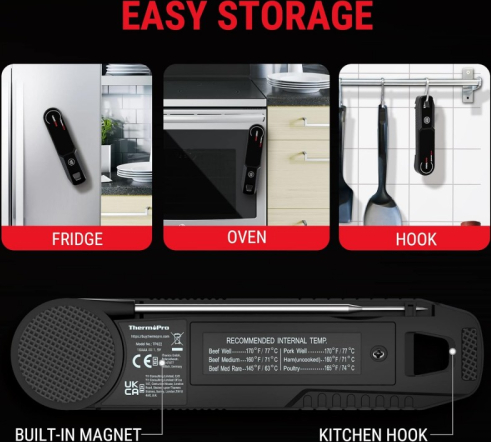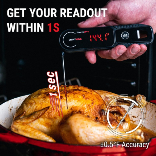 | Gatavojiet gaļu precīzi ar ThermoPro TP622W! Šis kvalitatīvais digitālais termometrs nodrošina precīzus temperatūras rādījumus tikai 1 sekundes laikā! Termometrs ir salokāms, tam ir magnētiska aizmugure un āķis, un tas ir IP65 ūdensizturīgs. T P622W ir lieliska izvēle gan pieredzējušiem, gan iesācējiem maizniekiem.- 1 sekundes rādījumu nolasīšanas laiks: Šis termometrs ir līdz pat 200 % ātrāks par konkurentiem! -±0,5°C precizitāte. -180° pagriežams displejs: 2" displejs ar aizmugurējo apgaismojumu pagriežas, kad termometrs ir apgriezts, tāpēc rādījumus var apskatīt no dažādiem leņķiem, padarot to par lielisku izvēli pavāriem ar kreiso roku. - IP65 izturība un materiāli :termometrs ir pilnībā ūdensizturīgs, un to var mazgāt zem tekoša ūdens, tāpēc to ir viegli tīrīt un jums nebūs jāuztraucas par tā atstāšanu lietū. Termometrs ir pārklāts ar īpašu materiālu un rakstu, kas novērš termometra slīdēšanu, ja to turat rokās ar slapjām rokām. -Automātiska izslēgšanās un miega režīms: kustību sensors termometru pacels no miega režīma, tiklīdz to paņemsiet rokās, un pēc 90 sekundēm tas būs pilnīgi nekustīgs. Pēc 90 sekundēm termometrs pāries miega režīmā un pagarinās akumulatora darbības laiku. - NSF sertifikāts. Tas nozīmē, ka tie ir droši pārtikai, augstas kvalitātes un videi draudzīgi. ![]() ![]() ![]() ![]() ![]() |